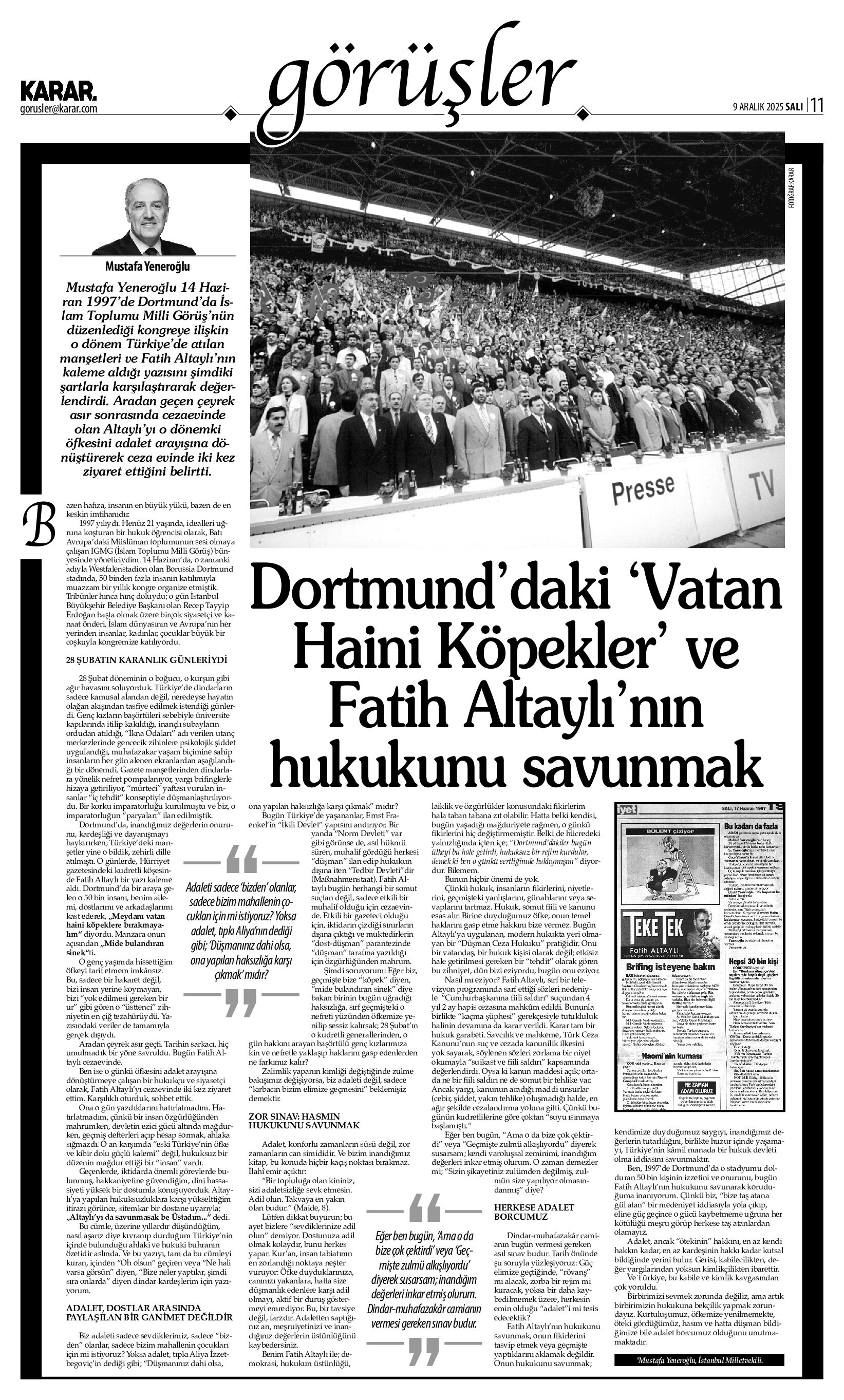 Mustafa Yeneroğlu 14 Haziran 1997’de Dortmund’da İslam Toplumu Milli Görüş’nün düzenlediği kongreye ilişkin o dönem Türkiye’de atılan manşetleri ve Fatih Altaylı’nın kaleme aldığı yazısını şimdiki şartlarla karşılaştırarak değerlendirdi. Aradan geçen çeyrek asır sonrasında cezaevinde olan Altaylı’yı o dönemki öfkesini adalet arayışına dönüştürerek ceza evinde iki kez ziyaret ettiğini belirtti.