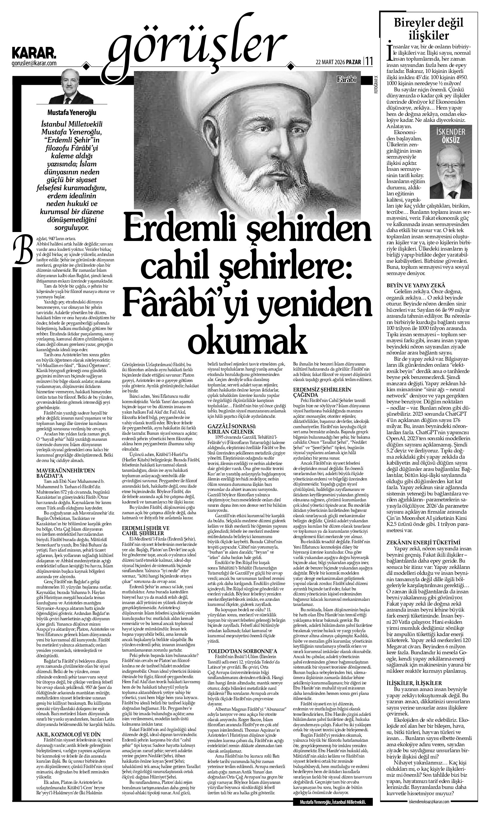 İstanbul Milletvekili Mustafa Yeneroğlu, “Erdemli Şehir”in filozofu Fârâbî’yi kaleme aldığı yazısında; İslam dünyasının neden güçlü bir siyaset felsefesi kuramadığını, erdem idealinin neden hukukî ve kurumsal bir düzene dönüşemediğini sorguluyor.