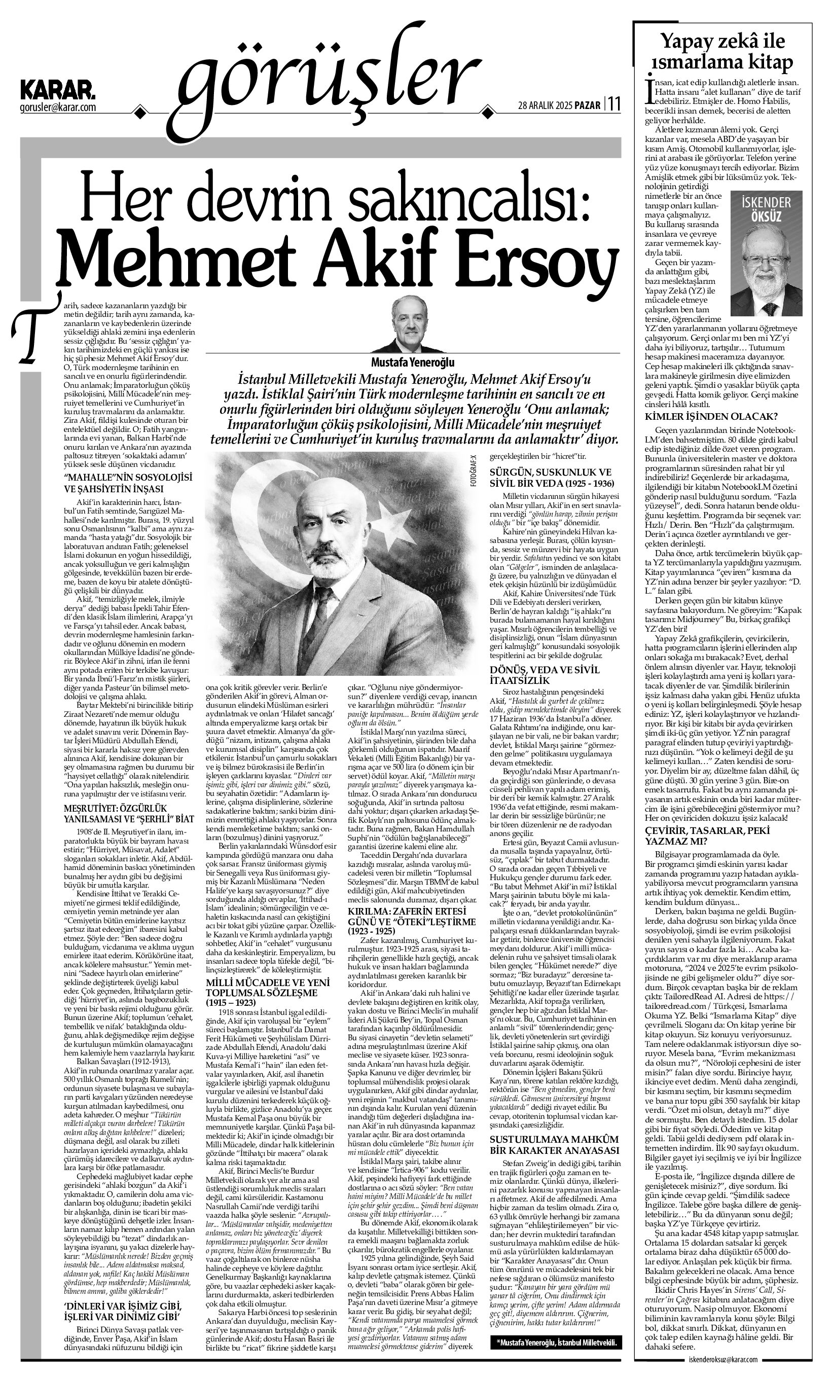 İstanbul Milletvekili Mustafa Yeneroğlu, Mehmet Akif Ersoy’u yazdı. İstiklal Şairi’nin Türk modernleşme tarihinin en sancılı ve en onurlu figürlerinden biri olduğunu söyleyen Yeneroğlu ‘Onu anlamak; İmparatorluğun çöküş psikolojisini, Milli Mücadele’nin meşruiyet temellerini ve Cumhuriyet’in kuruluş travmalarını da anlamaktır’ diyor.