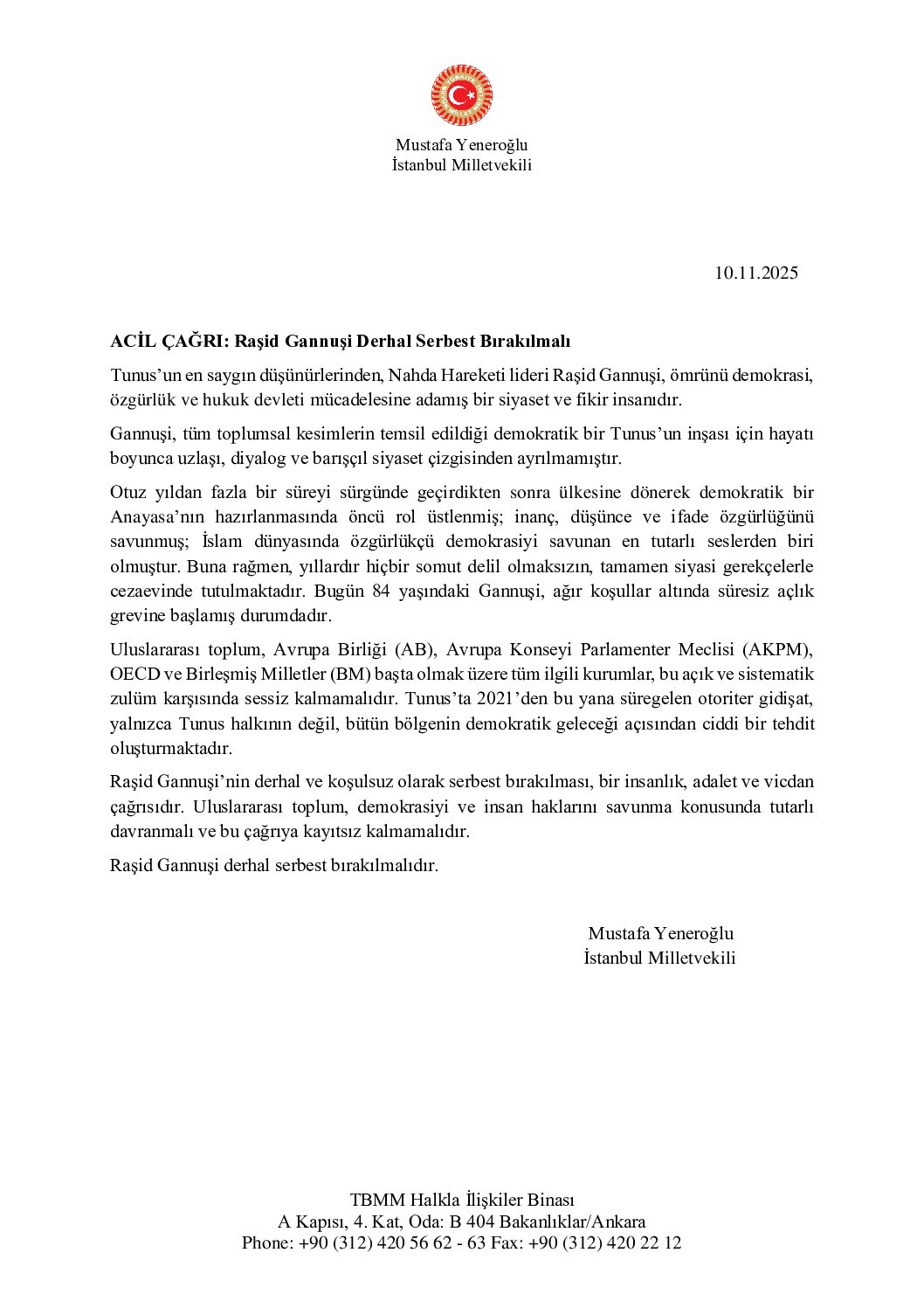Raşid Gannuşi’nin derhal ve koşulsuz olarak serbest bırakılması, bir insanlık, adalet ve vicdan çağrısıdır. Uluslararası toplum, demokrasiyi ve insan haklarını savunma konusunda tutarlı davranmalı ve bu çağrıya kayıtsız kalmamalıdır.”