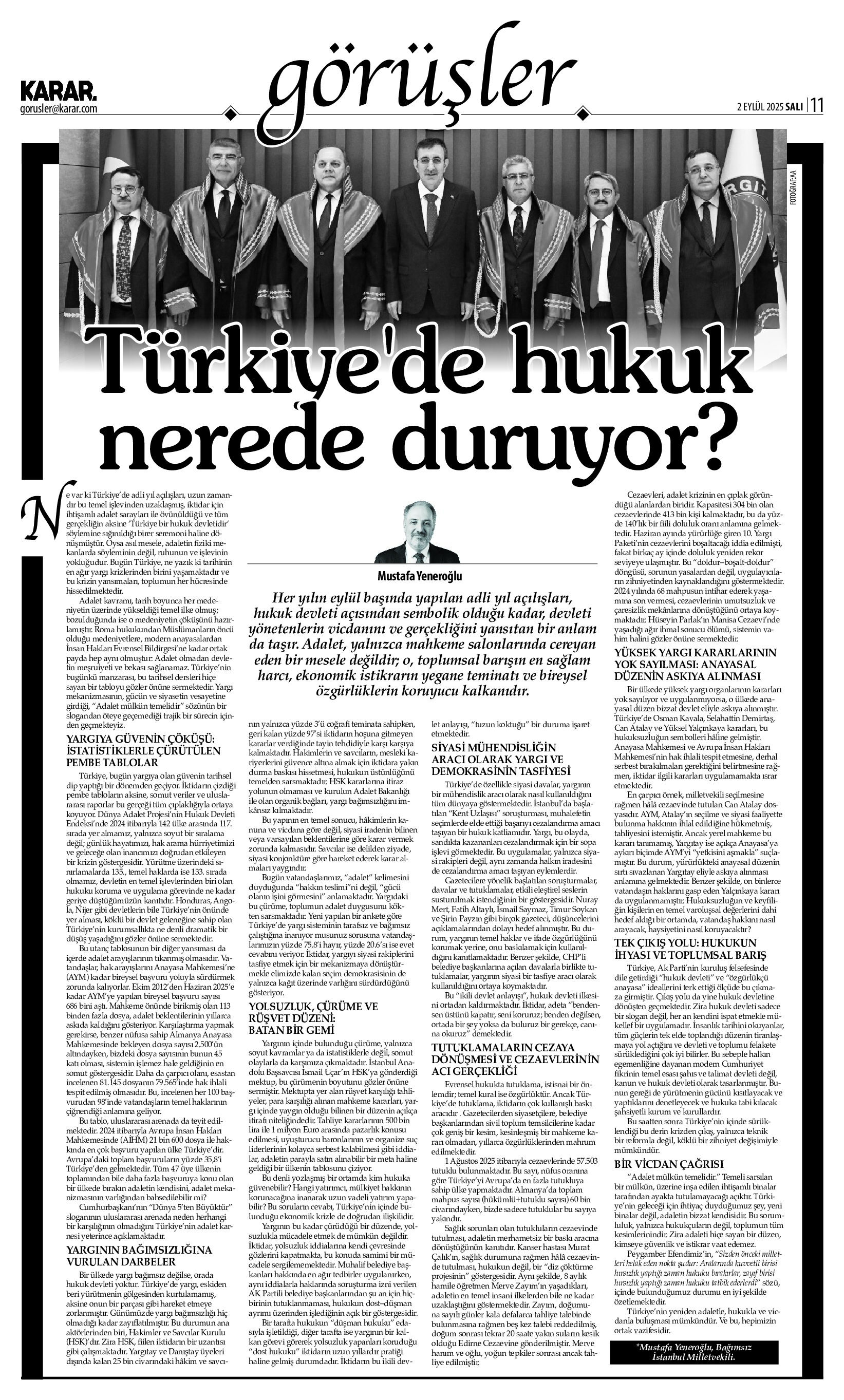 Bir ülkede yüksek yargı organlarının kararları yok sayılıyor ve uygulanmıyorsa, o ülkede anayasal düzen bizzat devlet eliyle askıya alınmıştır. Türkiye’de Osman Kavala, Selahattin Demirtaş, Can Atalay ve Yüksel Yalçınkaya kararları, bu hukuksuzluğun sembolleri hâline gelmiştir. Anayasa Mahkemesi ve Avrupa İnsan Hakları Mahkemesi’nin hak ihlali tespit etmesine, derhal serbest bırakılmaları gerektiğini belirtmesine rağmen, iktidar ilgili kararları uygulamamakta ısrar etmektedir.